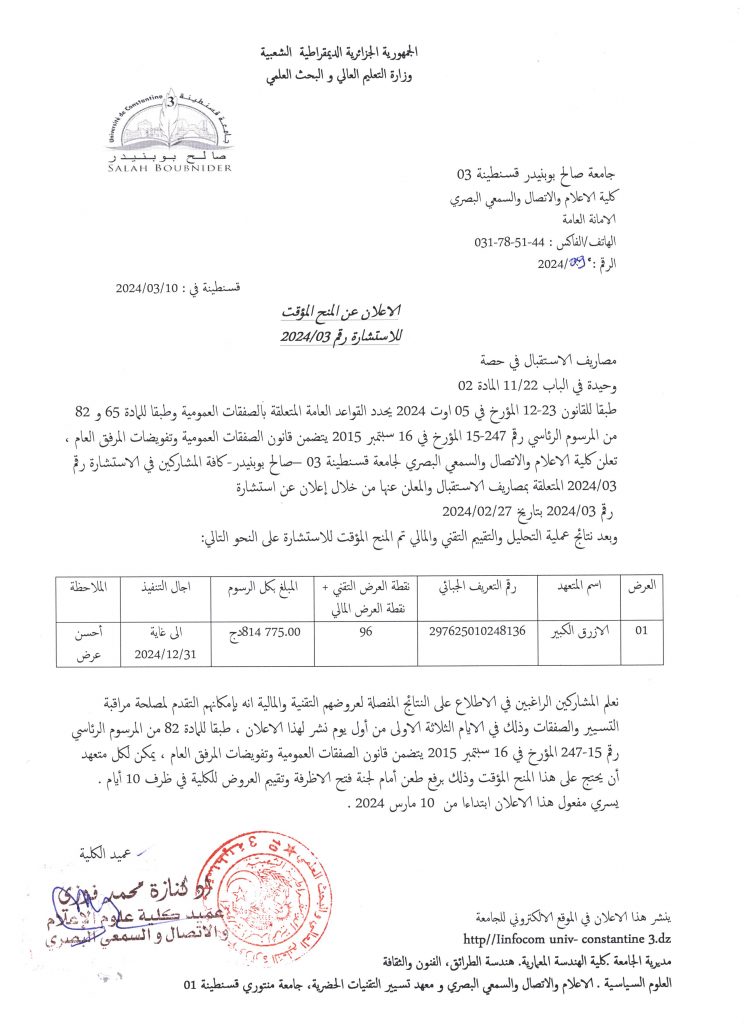 إعلان عن المنح المؤقت للإستشارة رقم 03 /2024